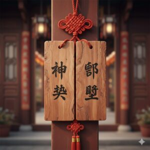 - 桃の木の板に文字を書いた、門に掛ける魔除け札